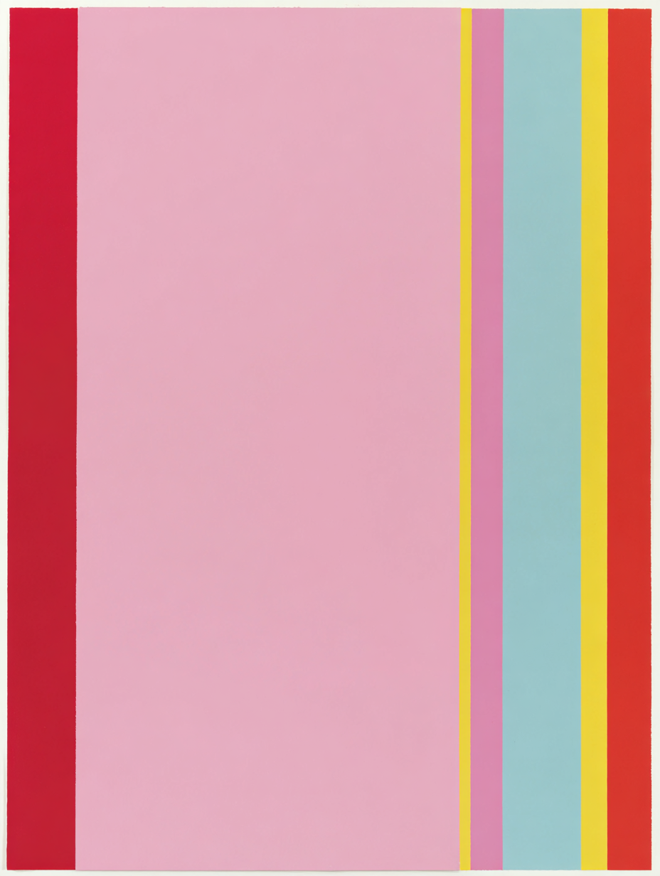 Wide fields of pink are bordered by precise bands of red, yellow, and blue, creating a measured dialogue between softness and intensity. The composition hums with quiet order, where each color edge sharpens the calm expanse beside it.