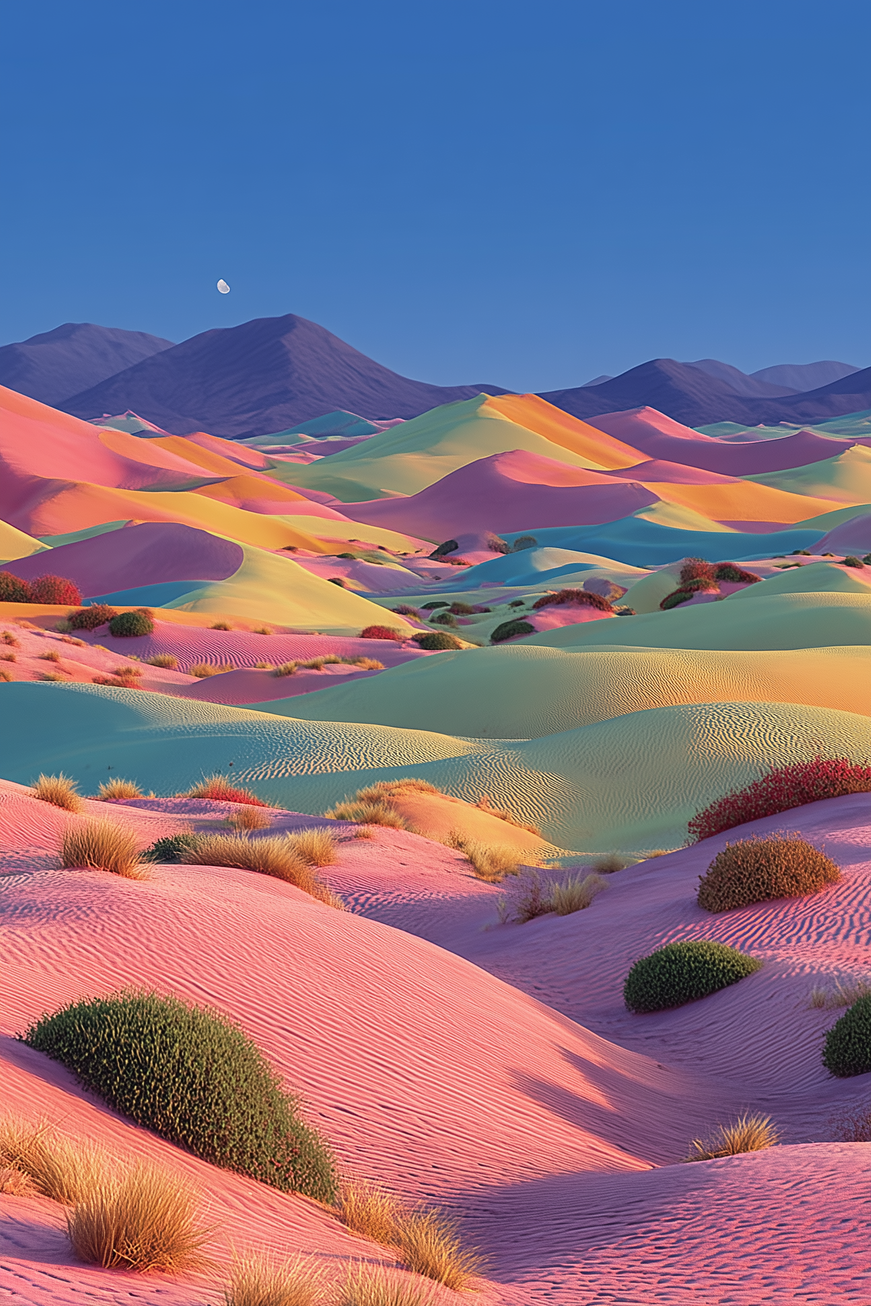 Waves of rose, gold, and turquoise dunes unfold beneath a sapphire sky, where the moon quietly lingers over distant peaks. The surreal palette transforms the desert into a living canvas, alive with rhythm and harmony. This piece evokes both wonder and stillness, making it a luminous addition to any discerning collection.