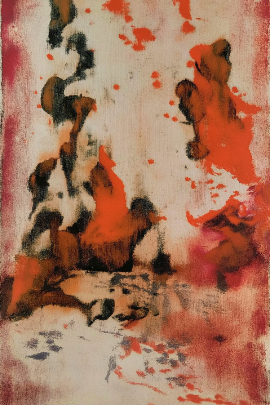 With smoky blacks dissolving into bursts of fiery red-orange, this abstract work captures the raw immediacy of something both burning and fading. The soft edges and fluid textures evoke a fleeting moment suspended between destruction and renewal. A compelling piece that infuses any collection with intensity, mystery, and a quiet, elemental power.