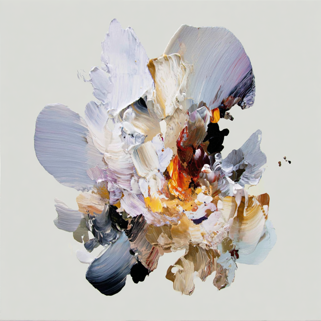With sweeping strokes of ivory, lavender, and ochre, this work radiates both delicacy and strength, as if a bloom were captured mid-flight. The fiery core contrasts against cooler tones, creating a sense of energy rising from within. At once serene and powerful, it offers a captivating focal point that enriches any contemporary collection.