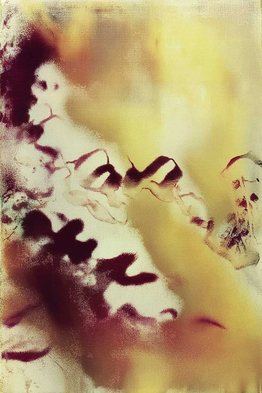 Soft golden tones dissolve into shadowy maroon forms, creating an atmospheric interplay between light and obscurity. The work exudes a dreamlike quality, as though glimpsing fleeting impressions suspended between memory and imagination. Both subtle and evocative, it brings warmth and quiet intensity to any curated space.