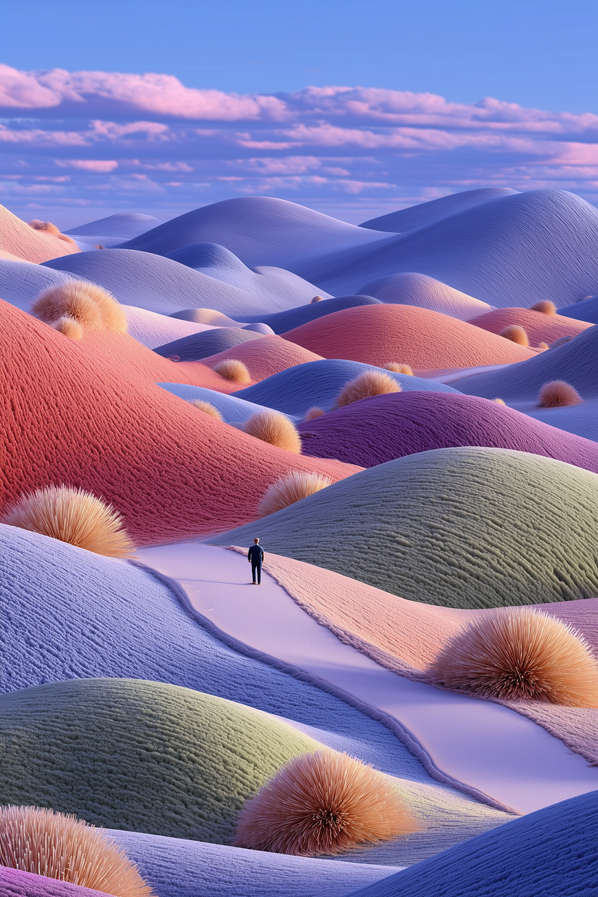 A lone figure drifts through undulating hills of violet, coral, and sage, where soft textures meet luminous skies. The surreal palette transforms the landscape into a meditation on solitude and discovery, blurring the line between dream and reality. This evocative work brings both serenity and intrigue, enriching any collection with its poetic balance of color and form.